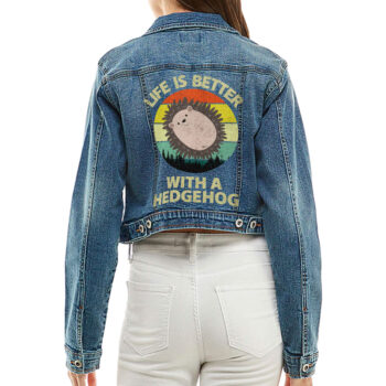 Hedgehog Themed Cropped Women’s Denim Jacket – Hedgehog Lover Gifts for Women – Cool Gifts