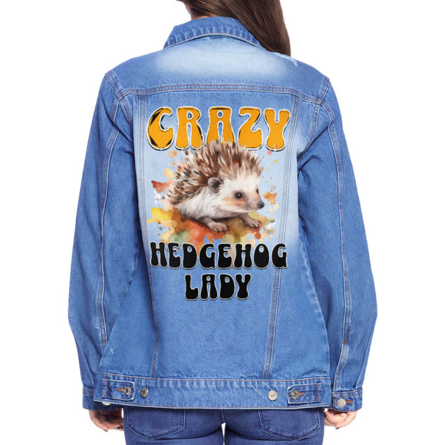 Hedgehog Themed Ladies’ Denim Jacket with Fleece Hoodie – Hedgehog Lover Gifts for Women – Cool Gifts